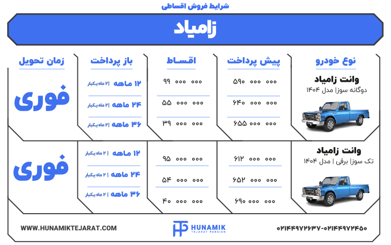 در این پاراگراف قصد داریم تا شما را با برخی از نکات مهم مرتبط فروش اقساطی زامیاد آشنا سازیم. این چنین راحت تر می توانید متناسب با توان مالی و سرمایه ای که در اختیار دارید، نسبت به خرید اقساطی محصولات زامیاد اقدام نمائید. از جمله محصولات شرکت زامیاد می توان به وانت پادار، وانت پیکاپ ریچ، وانت درکا، وانت نیسان جونیور دیزل، وانت استرالیس، وانت یوروکارگو و نیسان جونیور یا همان نیسان آبی اشاره نمود. بنابراین در خصوص شرایط فروش اقساطی زامیاد می توانید با کارشناسان فروش هونامیک تجارت تماس حاصل فرمائید. پس از کسب اطلاعات جامع در خصوص شرایط پیشنهاد شده، راحت تر می توانید نسبت به خرید اقساطی زامیاد اقدام نمائید. محصولات شرکت زامیاد زیر مجموعۀ شرکت خودروسازی سایپا به بازار عرضه می شوند. در نتیجه هنگام استفاده از خدمات فروش اقساطی زامیاد، می توانید نگاهی به محصولات فروش اقساطی سایپا نیز داشته باشید.