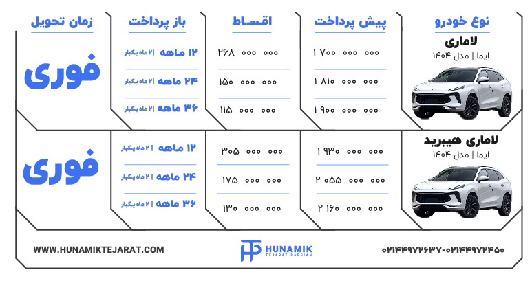 فروش اقساطی لاماری با شرایط تحویل فوری خودرو، پس از پرداخت پیش قسط یا مبلغ علی الحساب، توانسته رضایت مندی بسیاری از مشتریان را به خود جلب کند. خودروی لاماری در میان اتومبیل های هم ردۀ خود در سطح قابل قبولی قرار گرفته می شود. به همین دلیل طرفداران خاص خود را دارد ولی به خاطر افزایش قیمت خودرو در داخل کشور، علاقه مندان به این محصول، تلاش می کنند برای خرید اقساطی لاماری با شرایط اقساط بلند مدت و تحویل آنی خودرو برنامه ریزی کنند. در صورت تمایل به کسب اطلاعات بیشتر در زمینۀ فروش اقساطی لاماری ایما، می توانید با مجموعه هونامیک تجارت تماس بگیرید.