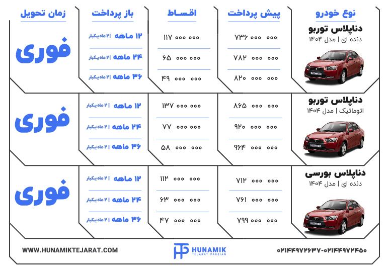 فروش اقساطی دنا در لیست خدمات مجموعه هونامیک تجارت مشاهده می شود چون خیلی از افراد متقاضی خرید اقساطی خودروهای داخلی و خارجی هستند. در واقع افزایش چند برابری و ناگهانی قیمت خودرو در ایران، شرایط را تنها برای ارائه خدمات فروش اقساطی دنا هموار ساخته است. اتومبیل دنا به دلیل مشخصات فنی در سطح متوسط رو به بالایی که دارد، مورد پسند بسیاری از افراد قرار گرفته می شود ولی افزایش قیمت اتومبیل دنا در سال های اخیر، موجب گردیده به سمت و سوی خرید اقساطی دنا گرایش پیدا کنند. اگر در پی استفاده از موقعیت های این چنینی هستید، می توانید متناسب با سرمایه ای که در اختیار دارید، بهترین برنامه ریزی را برای بهره مندی از شرایط فروش اقساطی دنا در نظر بگیرید. متأسفانه بی ثباتی بازار و وضعیتی اقتصادی جامعه، مراکز عرضۀ خودرو را وادار به ارائه پیشنهادات جایگزین نموده است و در نتیجه چنین اتفاقی، شرایط برای ادامۀ فعالیت در این حوزه را هموار سازند.