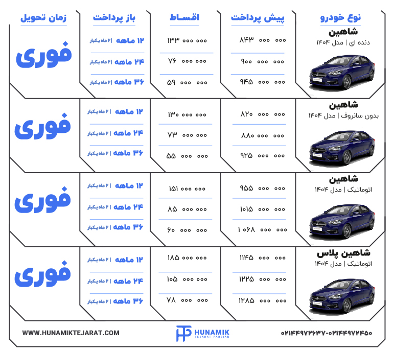 فروش اقساطی شاهین در سطح بازار توسط مجموعه هونامیک تجارت ارائه داده می شود چون این مجموعۀ معتبر دارای سابقۀ طولانی در عرصۀ خرید و فروش خودروهای داخلی می باشند. مراکز عرضۀ خودرو در چند سال اخیر خواستار ارائه طرح فروش اقساطی شاهین هستند. خودروی شاهین از محصولات سایپا به شمار می رود و اولین مدل از این خودرو در سال 1397 در نماشگاه خودرو رونمائی شده است. اگر نگاهی به بازار عرضۀ خودرو در ایران داشته باشید، قطعاً با افزایش قیمت های اتومبیل رو برو می شود که حاصل وضعیت بی ثبات اقتصاد جامعه می باشد. باعث گردیده افرادی که تمایل به خرید این مدل خودرو را دارند، نسبت به خرید اقساطی شاهین برنامه ریزی داشته باشند. بنابراین متناسب با وضعیت مالی که از آن برخوردار هستید، خدمات فروش اقساطی شاهین می تواند بهترین موقعیت را برای خرید این خودرو مهیا سازد.