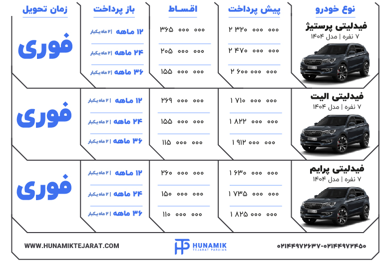 خرید اقساطی فیدلیتی را می توانید با شرایط متفاوت از طریق مراکز عرضۀ خودرو انجام دهید چون مبتنی بر نظر و پیشنهادات مدیران آن مجموعه تعیین می گردد. اگر در پی استفاده از خدمات فروش اقساطی فیدلیتی با شرایط اقساط بلند مدت هستید، میزان سود بازپرداخت پس از تسویه کامل بایستی مورد بررسی قرار گرفته شود. چنانچه علاقه مند به سرمایه گذاری در یک حوزۀ مطمئن هستید، متناسب با بودجه ای که در اختیار دارید، می توانید از پیشنهادات فروش اقساطی فیدلیتی با شرایط تحویل فوری بهره مند گردید.با وضعیت کنونی جامعه که شاهد افزایش قیمت های خودرو و بی ثباتی بازار خرید و فروش خودرو هستیم، ارائه راهکار و پیشنهادات جایگزین، می تواند مانع از رکود این بازار گردد. جهت بررسی جزئیات و دریافت مشاوره تخصصی در زمینه فروش اقساطی فیدلیتی می توانید با مشاوران هونامیک تجارت تماس حاصل فرمائید.