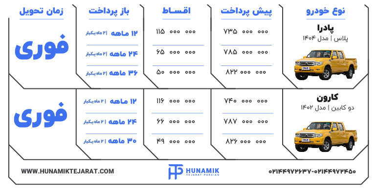شرایط فروش اقساطی پادرا و کارون (آذر 1404)