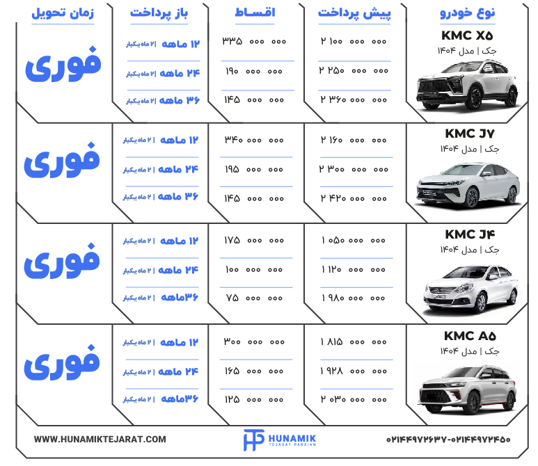 فروش اقساطی Jac به واسطۀ مجموعه هونامیک تجارت به مشتریان پیشنهاد داده می شود. در نتیجه افرادی که علاقه مند به خرید یکی از تیپ های متفاوت اتومبیل Jac منجمله جک کی 7، جک اس 3، جک اس 5، جک اس 5 توربو جی دی آی و جک تی 8 را دارند، می توانند از شرایط جدید فروش اقساطی Jac بهره مند گردند. در برخی از مواقع، خرید اقساطی Jac متناسب با سود بازپرداختی که دارد، صرفۀ اقتصادی خواهد داشت. هنگام روبرو شدن با چنین وضعیتی، به سهولت می توانید تصمیم نهایی خود را نسبت به خرید اقساطی جک بگیرید. امروزه مراکز عرضۀ خودرو، توانسته اند با تسهیل نمودن شرایط فروش اقساطی جک ، بهترین موقعیت را برای مشتریان فراهم آورند. یک سواری دلنشین و متفاوت را می توانید با خودروهای جک تجربه کنید. لازم به ذکر است که شرایط فروش اقساطی جک را بایستی با دقت مورد مطالعه قرار دهید و پس از تطبیق با موقعیت مالی خود، از چنین امکاناتی بهره مند گردید.